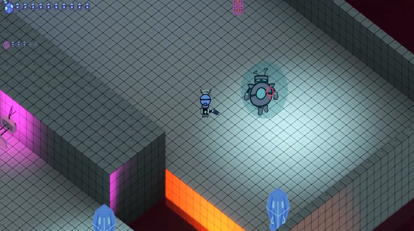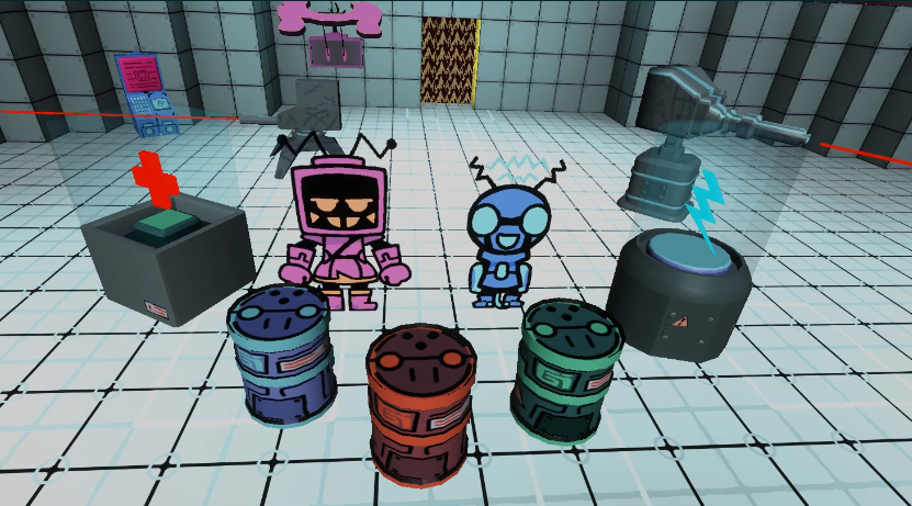 top-down action game where you control two robots simultaneously using a swap system. It alternates between Ro53 (The brawler) and M1L0 (The support) to advance through the halls.